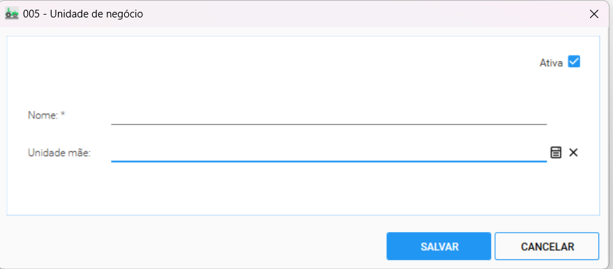 * Em "Unidade-mãe", indique a unidade de negócio principal à qual a nova unidade estará vinculada, estabelecendo uma relação hierárquica e organizacional no sistema.