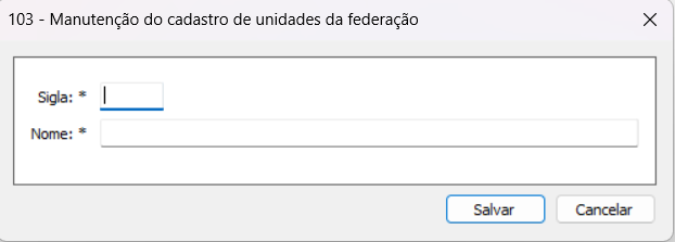 Para cadastrar uma nova unidade da federação, clique em "Incluir" e preencha os campos "Sigla" e "Nome"; em seguida, clique em "Salvar".&#x20;