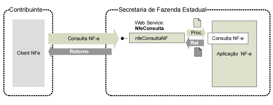 O aplicativo do contribuinte envia a solicitação para o Web Service da Secretaria de Fazenda Estadual. Ao receber a solicitação a aplicação do Portal da Secretaria de Fazenda Estadual processará a solicitação de consulta, validando a Chave de Acesso da NF-e, e retornará mensagem contendo a situação atual da NF-e na Base de Dados e todos os protocolos dos eventos existentes para a NF-e consultada.